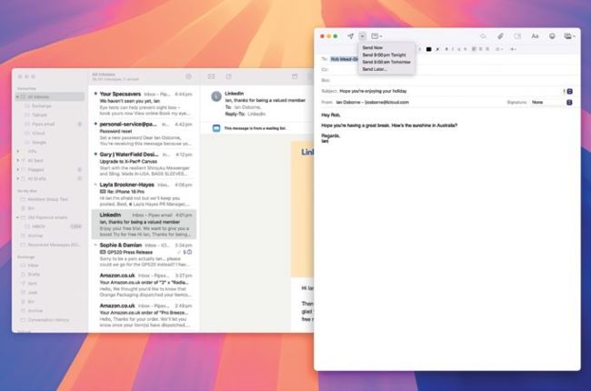 You can save time by writing emails at your convenience and having them sent later, automatically. First, prepare your outgoing email in the usual way, but instead of clicking the Send button, click the chevron next to it.