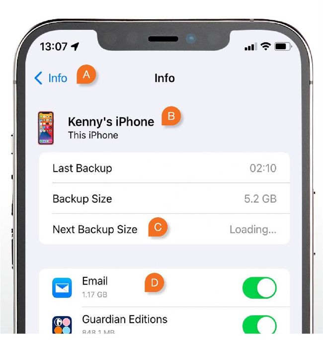 BACKUP SIZE This screen also tells you the next backup size, so you can switch off some items or buy more storage.