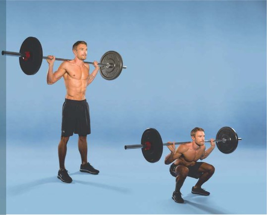 Rest a barbell on your traps, with your hands twice shoulder-width apart and your body in a straight line from head to heels. Your feet should be shoulder-width apart and slightly turned out. Squat until your thighs are at least parallel to the floor, then drive through your feet to return to the start. Don’t let your back round at any point during the move.