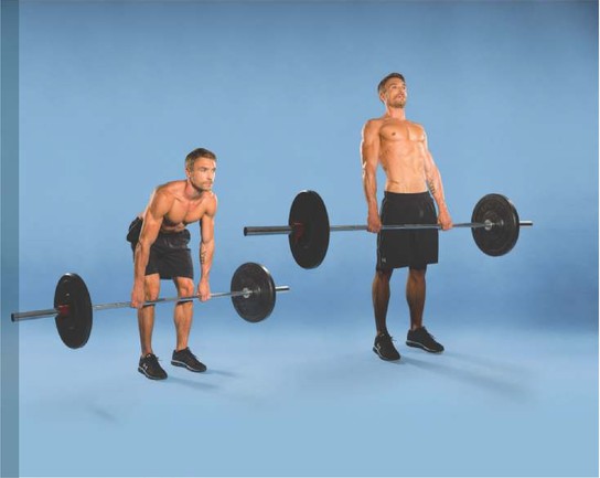 Stand with your body straight from head to heels and your feet shoulder-width apart, holding a barbell in front of your thighs. Start to lower it down your legs, hinging at the hips. Bend your legs slightly to let it travel down your shins until you feel a good stretch in your hamstrings. Push through your heels to stand.