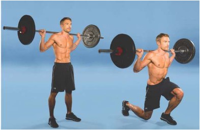 Rest a barbell on your traps, with your hands twice shoulder-width apart, your body straight and feet shoulder-width apart. Take a big step forwards and lower until your back knee brushes the floor. Don’t let your front knee get ahead of your knee. Push down through your front foot to return to the start position.