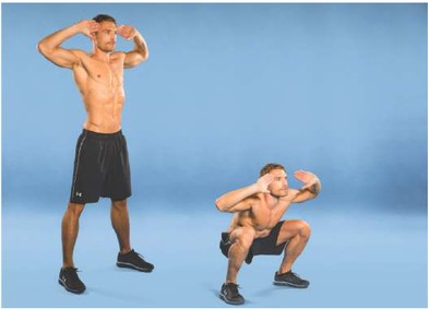 Stand with your body straight and your hands by your temples. Squat until your thighs are at least parallel to the floor. Drive through your feet to stand and don’t let your back round.
