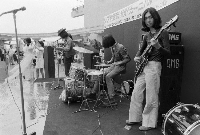 Top of the City Pops: Happy End (from left, Eiichi Ohtaki (in hat), Takashi Matsumoto, and Haruomi Hosono) perform in a parallel pop universe at the Shibuya Seibu May Carnival, 1970.