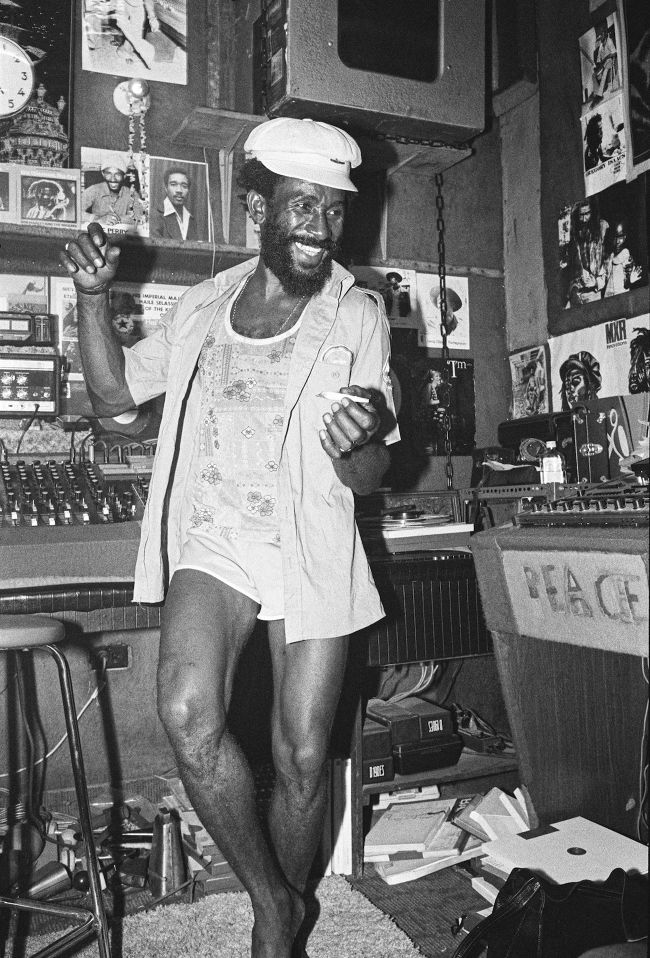 Lee ‘Scratch’ Perry makes his point outside the Black Ark studio in Washington Gardens, Kingston, Jamaica, 1976