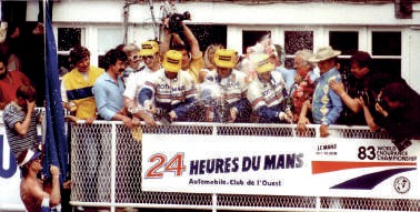 Above: Vern Schuppan, Hurley Haywood and Al Holbert celebrate a close-run victory after their 956 engine seized but restarted