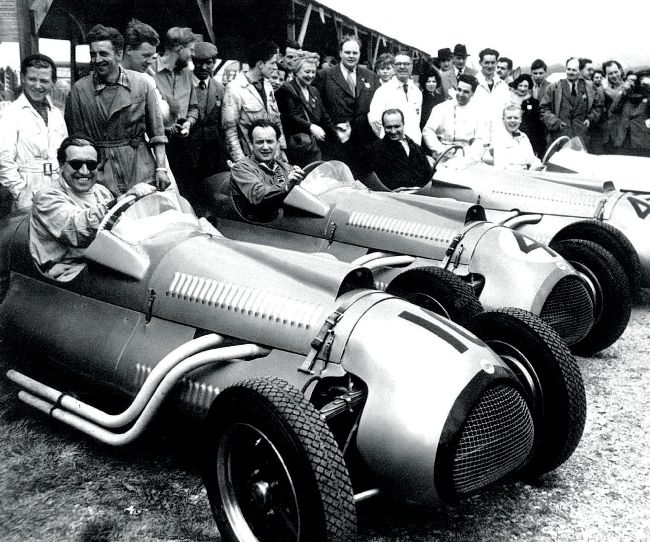 Alan Brown, Eric Brandon, Juan Manuel Fangio and Mike Hawthorn at Goodwood, 1952