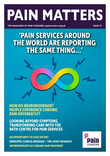 91 Sensory overload, masking symptoms, the pressure to ‘blend in’… Emerging research highlights a significant link between neurodiversity and chronic pain. We are delighted to explore this key issue with the Bath Centre for Pain Services, a world-class institution leading the way in person-centred treatment. Through a focus on neurodiversity, here they shine a light on underrepresented challenges and harmful misconceptions, illuminating the idea that every patient is different and needs to be treated, and appreciated, as such. Inside you’ll find common myths debunked, tips on improving clinical care (for both patients and professionals) and lived-experience testimony from the inspirational 17-year-old Libby Eastman. Also featured are a tool for healthcare appointments and our latest expert-led guide on using antidepressants for pain treatment.