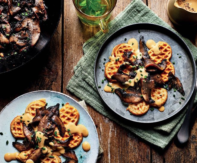 6 Serve the waffles topped with the mushrooms, a drizzle of the dressing and a sprinkle of chives.