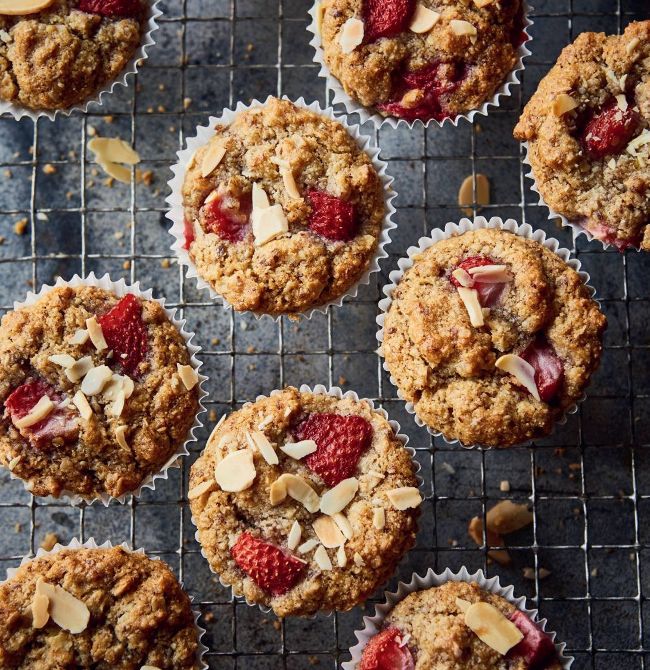 4 Add the sunflower oil to the dry ingredients, along with the maple syrup, vanilla extract and flax eggs, and stir thoroughly until everything is well mixed. 5 Quarter the strawberries, removing the green tops. Stir three-quarters of the flaked almonds and three-quarters of the strawberries into the batter, keeping the rest to decorate the tops of the muffins later on.