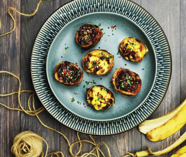 Banana skins are nutritious and, if prepared well, delicious! If you bake potatoes for use in mash or potato cakes, keep the skins and stuff them with this BBQ banana peel for a great, zero-waste lunch.