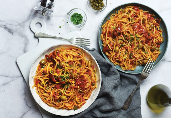 1 Add the olive oil to a saucepan over a medium heat, then add the red onion, garlic, chilli flakes, olives, sun-dried tomatoes and capers and cook for 4-5 minutes. Then, add the tinned tomatoes and vegetable stock and bring to the boil. Once boiling, add the spaghetti to the pan and cook for 10-12 minutes until the spaghetti is cooked and the sauce has thickened. Season to taste and sprinkle with chives.