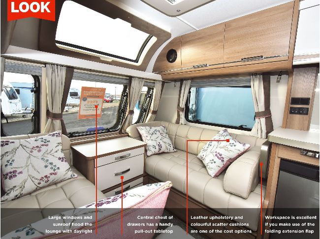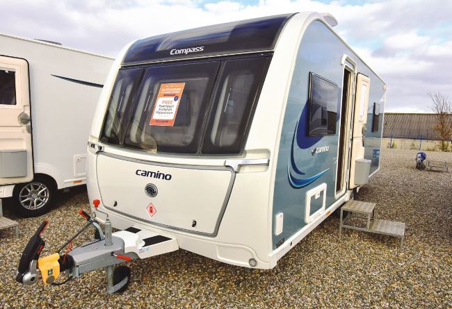 The Camino 550, which we saw at Westfield Caravans in Blackpool, provides a popular layout with a rear island bed, central shower and washroom, side kitchen and front lounge, all on a single-axle tourer.