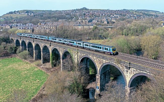 Two unidentified TransPennine Class 185s cross New Mills Viaduct on March 31 with the 14.18 Manchester Piccadilly-Cleethorpes train. TOM MCATEE