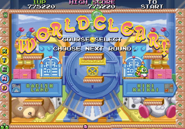 But while somebody else was making the NES Bubble Bobble Part II, a group of developers centred around Taito’s Osaka development branch were working on a project for the F3. Tentatively titled Bubble Bobble II, it went out for covert location testing in arcades in late-1993 to see if arcade players would still get excited over the prospect of a new Bubble Bobble. The response must have been encouraging in some way, because several months later in 1994, Bubble Symphony would make its arcade debut.