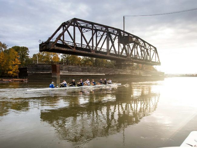 The action in a rowing photo never changes much but the backgrounds certainly do. Whether it is a change in season at the Head of the Charles in Boston when the leaves turn from bright green to deep reds, oranges and yellows, or a change from the summer heat to winter rain or in this case an old train bridge along the Fraser River in Burnaby B.C. Canada.