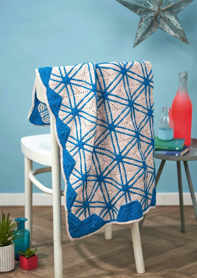 Blanket is made up of 56 Whole Hexagons, 14 Horizontal Half Hexagons, 8 Vertical Half Hexagons and 2 Quarter Hexagons. The Whole Hexagons are worked in rounds and the rem motifs are all worked in rows. Change colour on the final yrh before colour change is indicated. Carry the unused colour across the WS of your work, being careful to keep an even tension.