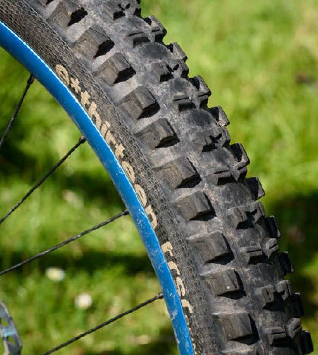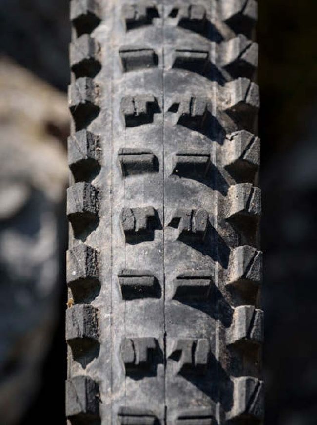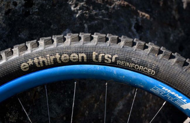 Joining e*thirteen’s ever-expanding product line-up last year, the e*thirteen TRSr is intended to slot in between lightweight cross-country tyres and super-burly downhill tyres – in the words of Goldilocks, not too hot and not too cold, but juuuust right. Or to put it another way, a regular trail tyre for everyday use. That might be doing these tyres a slight disservice though, as they’ve performed brilliantly throughout the test and are more than ‘just right’. Available in 27.5in and 29in options, with folding bead, reinforced sidewalls, reinforced pinch that zones and enduro casing, they tip the scales at 918g (27.5in, 900g quoted) and are designed to pop up tubeless with just a track pump and a scoop of sealant. True to their word they went up without needing a compressor on every rim we tried, every time. Available in two compounds (Race or Plus), we’ve been riding the softer, grippier, Race compound which is made up of 70a rubber at the base, 42a in the centre, and a 40a for the side knobs.