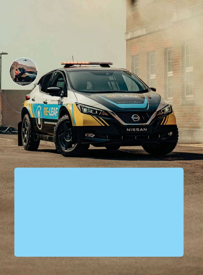 Excellent punning. Yep, this really is a Nissan Leaf, but unlike any we’ve ever seen before. It’s been decked out with off-road suspension, ultra-tough tyres and LED lighting to make it look like an emergency response vehicle.