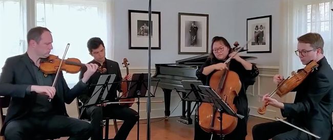 The Calidore Quartet’s bold interpretation of Dvořák’s ‘American’ Quartet was entirely absorbing, even on a screen. Jeffrey Myers’ warm sound led the quartet well, and I especially appreciated the tenderness with which he often played –a lovely contrast to the energy in the more aggressive sections. The Lento was not overly slow or nostalgic, but played quite elegantly; the cello solo by Estelle Choi was a standout. The Molto vivace was taken at a moderate tempo, stately and elegant, full of character and charm.