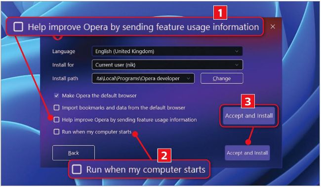 Download Opera One R2 for free from www.opera.com. When 1 prompted to share your usage information, click Options, then untick ‘Help improve Opera by sending feature usage information’ 1 . We’ve also unticked the option to ‘Run when my computer starts’ 2 . Click ‘Accept and Install’ 3 and Opera will ask about data sharing again. If you still don’t want to do this, click ‘Configure in settings’ and untick all four options for processing and using your data, then click ‘Confirm choices’. When Windows’ Settings appears, click the ‘Set default’ button next to ‘Make Opera your default browser’. Follow the onscreen instructions, choosing your preferred options.