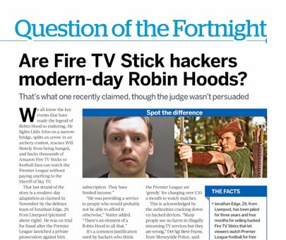 I’m glad the judge rejected Jonathan Edge’s ludicrous defence that selling hacked Amazon Fire TV Sticks makes him a modern-day Robin Hood (‘Question of the Fortnight’, Issue 698, pictured). But I’m not surprised Edge’s defence team used this justification, because it’s worryingly popular among the public.