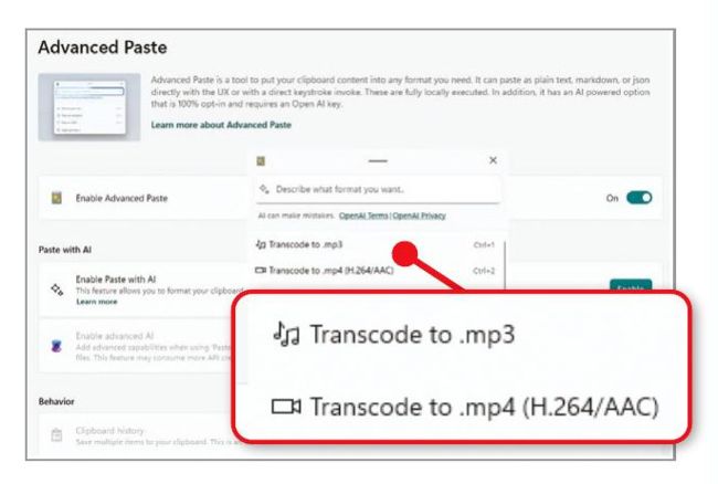 The latest version of PowerToys improves its Advanced Paste tool, which pastes content you copy to your clipboard in the format of your choice. Although primarily aimed at software developers, allowing them to quickly paste plain-text, markdown and JavaScript code, it now offers the universally useful ability to convert audio and video files into MP3 and MP4 format. Select ‘Enable Advanced Paste’ in PowerToys Settings, then press Windows key+Shift+V to open its window. When you copy content to your clipboard, Advanced Paste’s list of actions will update accordingly. These now include ‘Transcode to .mp3’ and ‘Transcode to .mp4’ (see screenshot). Select one to convert the content and paste the result in the source folder. You can also extract text from screenshots, by choosing ‘Image to text’, then Paste.