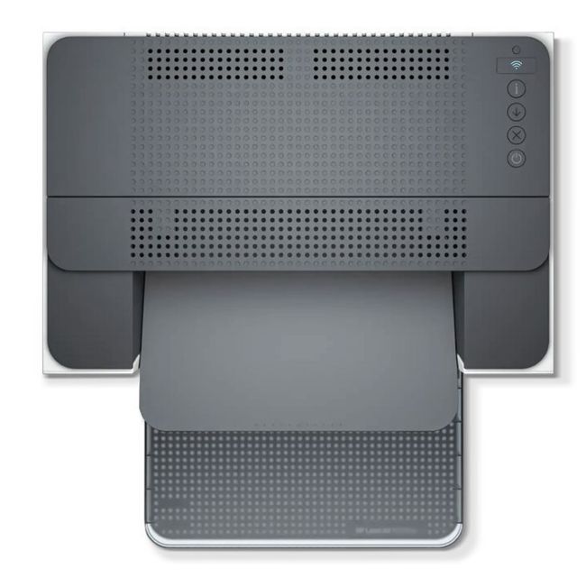 This affordable and compact mono laser printer is just 205mm tall with a small footprint of 355x427mm (WxD). And because its protruding paper tray can be removed when not in use you can reduce the depth to 280mm.