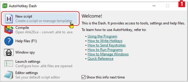 Select ‘New script’ on AutoHotkey’s Dash panel to begin creating your keyboard shortcut