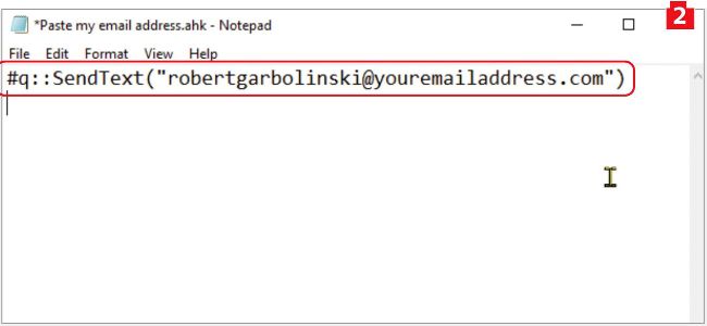 The following script will paste your email address when you press and hold the Windows key while tapping Q (so the shortcut is ‘Windows key+Q’). In Notepad, type #q::SendText("robertgarbolinski@ youremailaddress.com") 2 , replacing the section in quotes with your actual email address. You’ll also find this code on our Pastebin page, at www.snipca.com/54910.