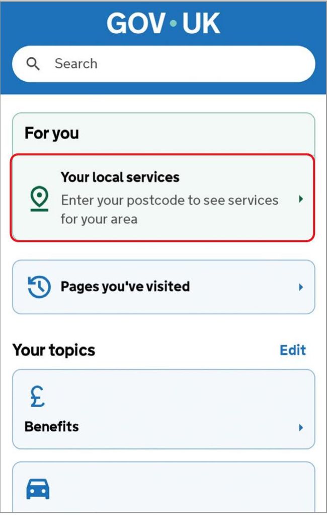 Tap ‘Your local services’ (see screenshot below left) and enter your postcode to access info from your local council. You can also search across all Gov.uk articles to find specific advice.