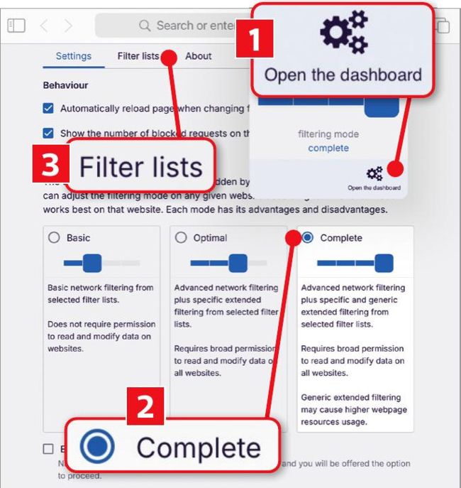 The extension will automatically block ads and trackers as you browse the web. You can adjust its default filtering mode by pressing the Extensions (jigsaw piece) icon in Safari’s address bar and tapping uBO Lite, then ‘Open the dashboard’ ( 1 in our screenshot below left).