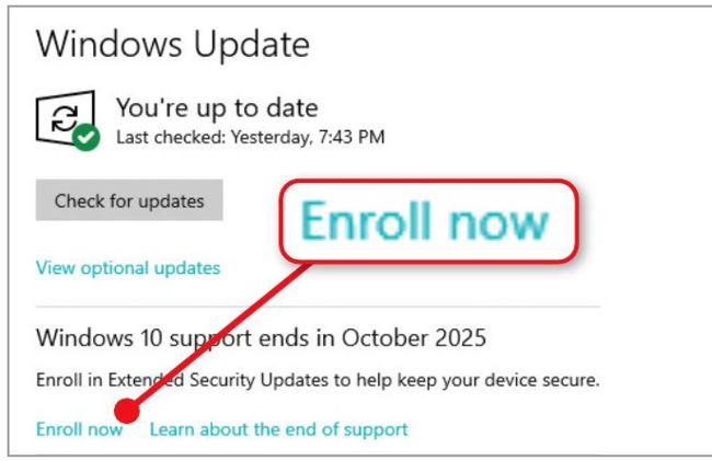 Click ‘Enroll now’ in Windows Update to launch the ESU wizard