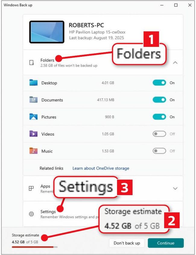 This will sync important folders, settings and credentials (logins and passwords) to your OneDrive account and automatically upload any new or changed files. It’s the easiest, cheapest and safest option, but there are a couple of catches. That’s why we called it “cynical and clever” on Microsoft’s part, when we reported the story in Issue 714 (page 6).