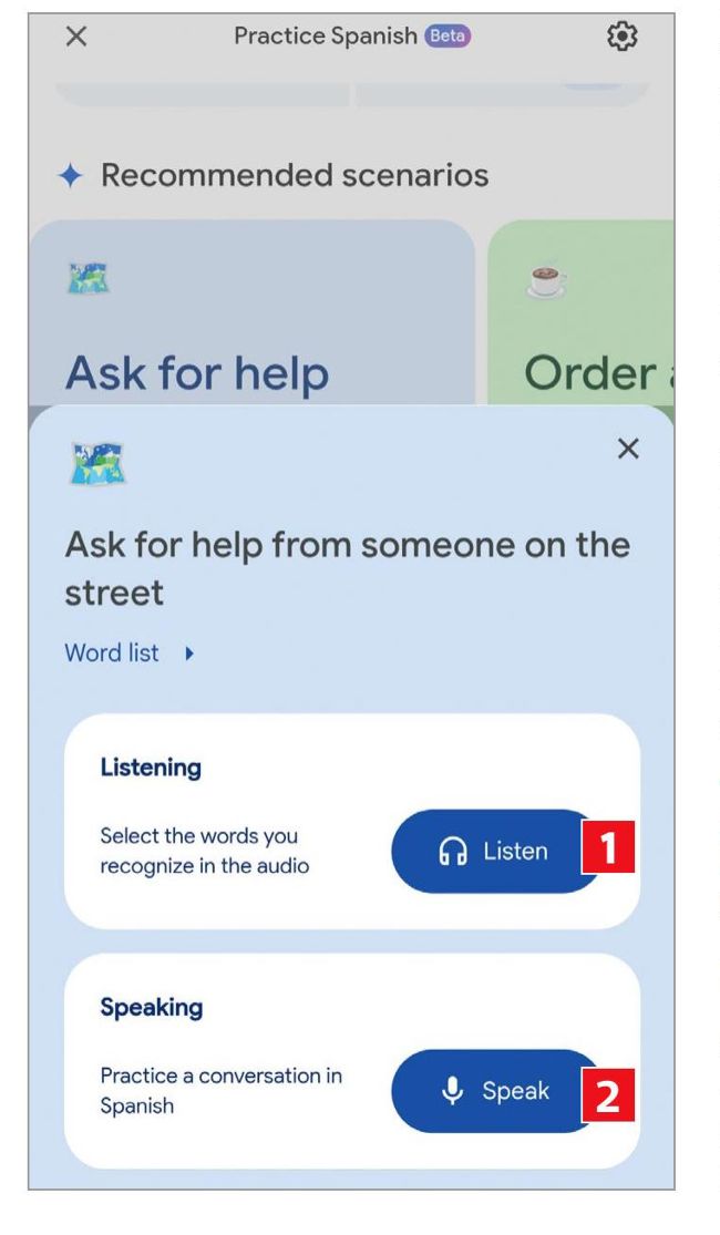 To get started, press the new Practice button in the Google Translate app for Android (www.snipca.com/56108) or iOS (www.snipca.com/56109), and tap ‘Get started’. Choose the language you want to practice – currently either Spanish or French – and select your skill level: Basic, Intermediate or Advanced.