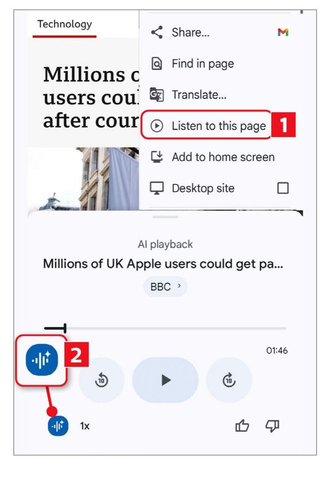 To try the new feature in Chrome for Android, tap the three-dot menu icon when viewing a web page and choose ‘Listen to this page’ ( 1 in our screenshot below left). You’ll see a ‘Generating AI playback’ message in a panel at the bottom of the screen, then the AI voices will start discussing the content.