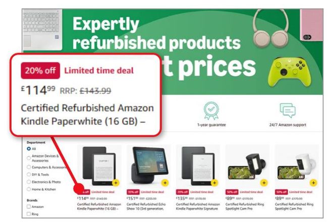 We spotted a ‘certified refurbished’ Ring Battery Video Doorbell Pro for £99 (40 per cent off the new price of £180) and a Kindle Paperwhite (16GB) for £115 (new price £144, see screenshot above). All products sold through Amazon Renewed are covered by Amazon’s one-year guarantee.