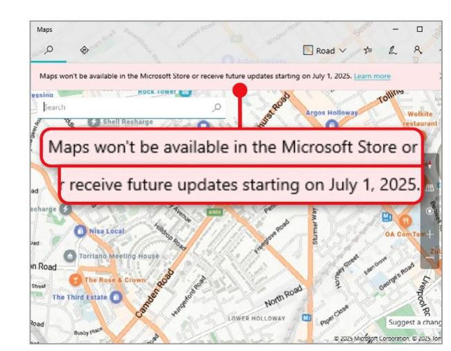 In July, Microsoft deprecated its Maps app for Windows 10 and 11, and removed it from the Microsoft Store (see screenshot below). It still works for the moment but won’t receive any updates.