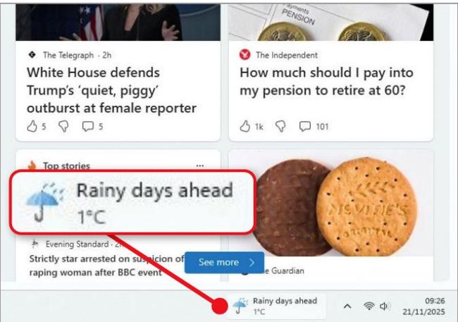 Windows 10 has ‘News & interests’, which displays the news and weather when you hover your cursor over its taskbar icon. Windows 11 has a Widgets feature, which shows a weather summary on its taskbar button (see screenshot below) and opens news stories and forecasts in Edge.