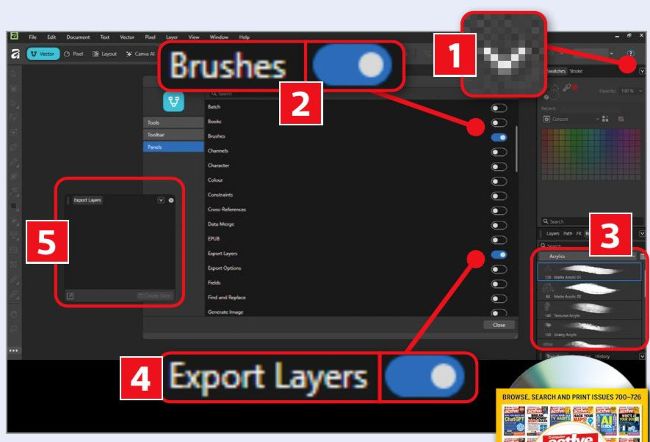 When you launch Affinity click the small down arrow at the top right ( 1 in our screenshot) then ‘Panels’. Turn on the slider next to each action you think you’ll carry out often. In my example I’ve turned on Brushes 2 which appears on the right 3 , and Export Layers 4 which appears as a moveable box 5 .