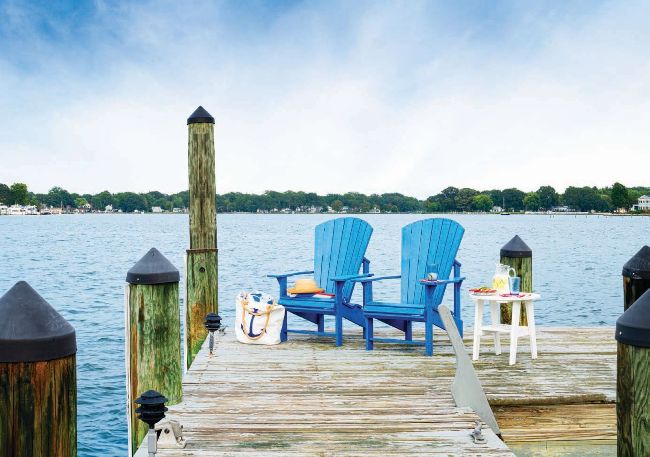 DOCK OF THE BAY. Turquoise Adirondacks are a place to sit before or after a boat ride on the West River.