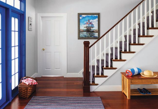 |ABOVE| A COASTAL WELCOME. Cobalt-blue found its way into the trim on the front door. Meanwhile, a stripy custom-cut foyer rug and stair runner tie the palette together.