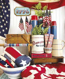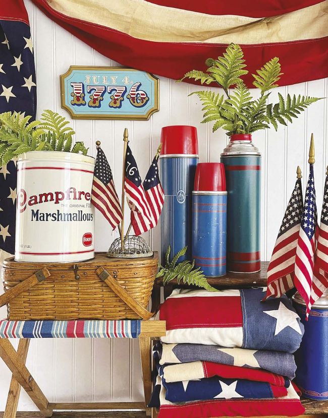 I’ve chosen a Fourth of July summer-camp theme for my vignette. To start, I gathered items in red, white and blue. I also included elements that communicate my story of summer camping, such as thermoses, a picnic basket, a marshmallow tin and the camp stool.
