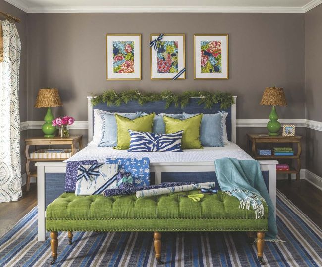 THAT’S A WRAP. An evergreen garland on the headboard and artwork dressed up with a bow speak to the season. This main bedroom is where the family’s presents get wrapped!
