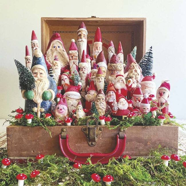 with your collection of Santas this season? Try the “Santas in a Box” trend. Created by Jennifer Adamson, owner of the online vintage shop Shared Belongings, this en-masse styling technique is a whimsical way to maximize the impact of your holiday décor.