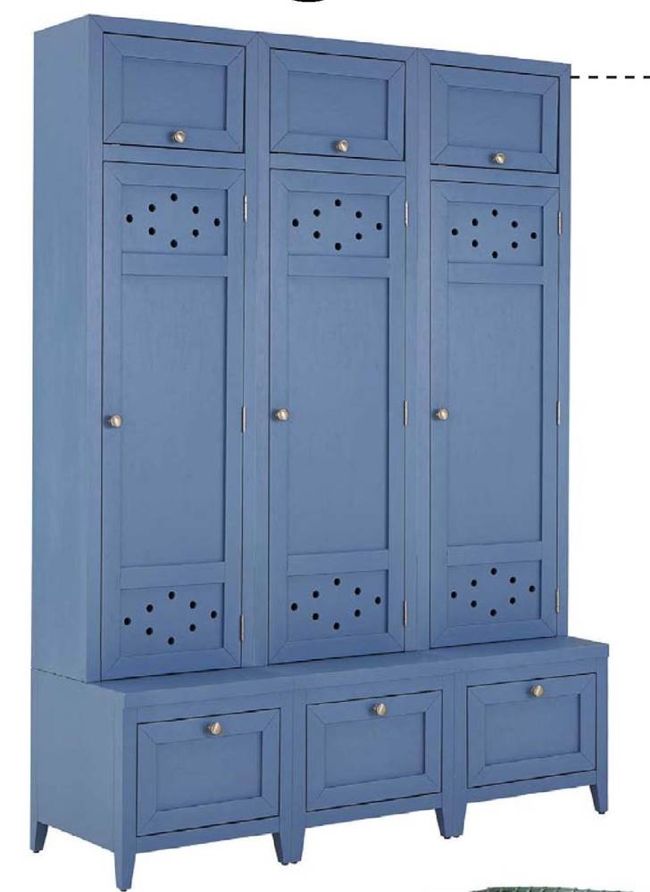 Alcott Entry Cabinets come in a set of three with top cubby garage doors that open and stay in position on gas lifts. Center storage cabinets feature three double hooks each.Doors reverse to suit your space; $3,299. Visit ballarddesigns.com.