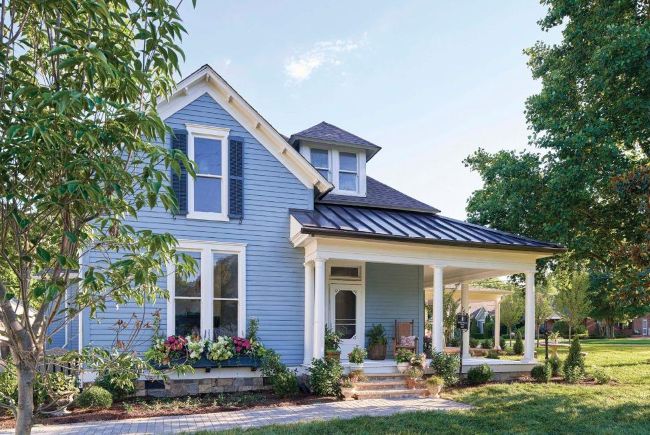 BLUE BELLE. Kara wanted the home’s exterior to stand out from the white homes on the street, so because blue was one of the homeowners’ favorite colors, she painted sample shades of blue on the house for them. “They absolutely loved the blues, especially with the brass lighting fixtures from Circa Lighting I had selected, and quickly chose their favorite shade,” she says. “We removed the aluminum siding and vinyl shutters, because those are a big ‘no-no’ for a historical home.” New, custom-painted shutters with louvers from Shuttercraft and rocking chairs from Troutman are pretty, as well as practical.