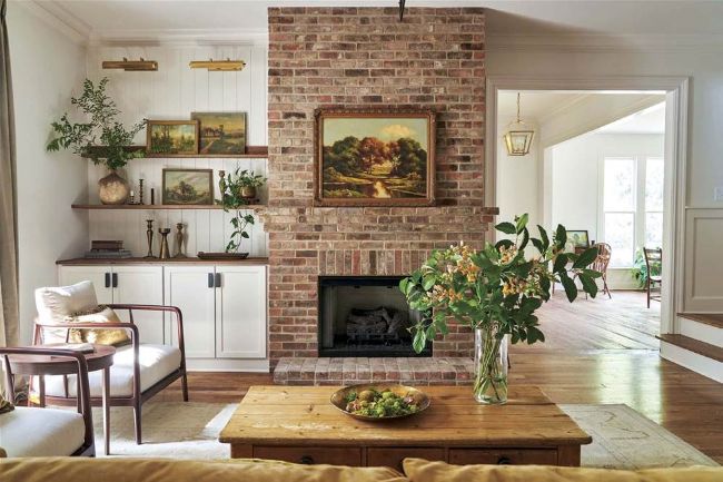 |ABOVE| WARMING UP THE FIREPLACE. The Garden Gate team added this new fireplace to the room, reusing salvaged brick from a demolition. Kara designed the oak shelves to include a gallery shelf atop a standard book-depth shelf so the homeowners can display artwork and taller decorative items on the shelf below it.