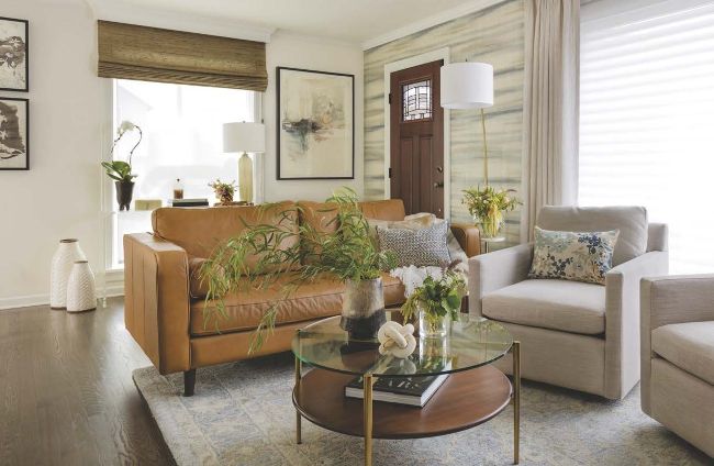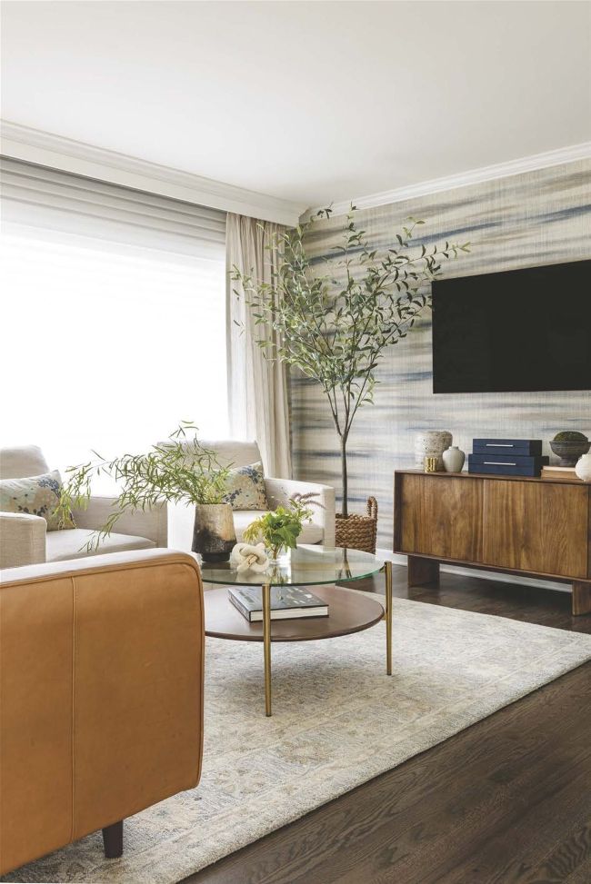 NATUR AL NEUTR ALS. The living room is a lesson in decorating a space with a neutral background that doesn’t rely on white walls, taking it to the next level. “The abstract grasscloth wallpaper adds texture and depth, creating a sophisticated backdrop for the space,” Jessica says. The result brings the living room to life. A wooden console and greenery further bring natural colors indoors.
