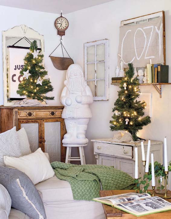 MERRY MAKEOVERS. Keeley’s living room nook features some of her favorite holiday DIY projects. “Typically, when I buy something retail, I don’t like to make it over, but I just felt like I had to try it on this Santa,” she shares. After buying the statue from Lowe’s, Keeley spray-painted it white to give it a whole new look. “He is one of my favorite pieces,” she says. In addition to transforming the Santa statue, Keeley also created the “Cozy” sign by freehanding the word onto an old canvas printer drop cloth.