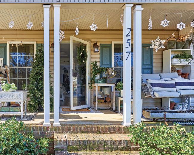 WELCOME HOME. Keeley turned her front porch into an inviting winter wonderland with some snowflake lights, a bare Christmas tree and a festive wreath. “I keep the outside very simple,” she says.